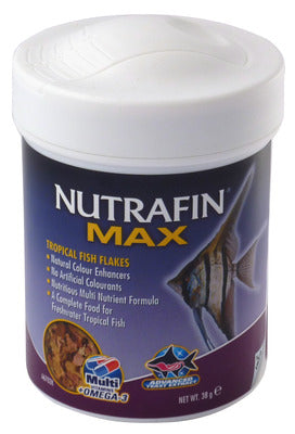 NUTRAFIN MAX TROPICAL FISH FLAKES 38G High quality flake tropical fish food from the internationally recognised brand Nutrafin. Comes with a tight closing plastic lid for safe long term storage and easy feeding. Suitable for most small to medium sized tropical aquarium fish.