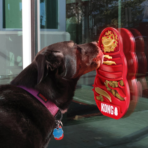 KONG Licks ridges and grooves hold Easy Treat, peanut butter, kibble, etc., for long-lasting licking. Fights boredom and occupies distraction during exams, baths and nail trims. Plus, licking releases endorphins that help soothe dogs. Two suction cups stick to flat surfaces for a movable feast of fun. Different ridge shapes hold variety of food, keeps pups interested and helps clean tongue and teeth.